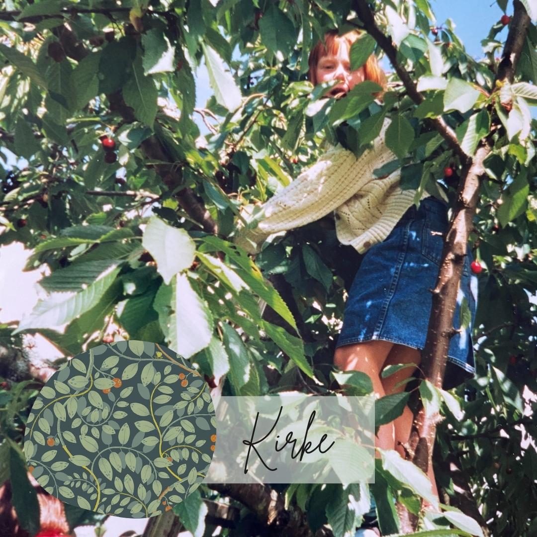 Mönstret ”Kirke” är den sinnesbild jag har från min farfar Ewalds körsbärsträd som jag klättrade i när jag var liten. Jag minns tydligt hur jag plockade de mörkröda bären med ett omfamnande bladverk runt omkring mig. Kirke är ett par varsamma händer som håller dig stadigt. Ett tak, ett rum – en skyddande sfär och stund.