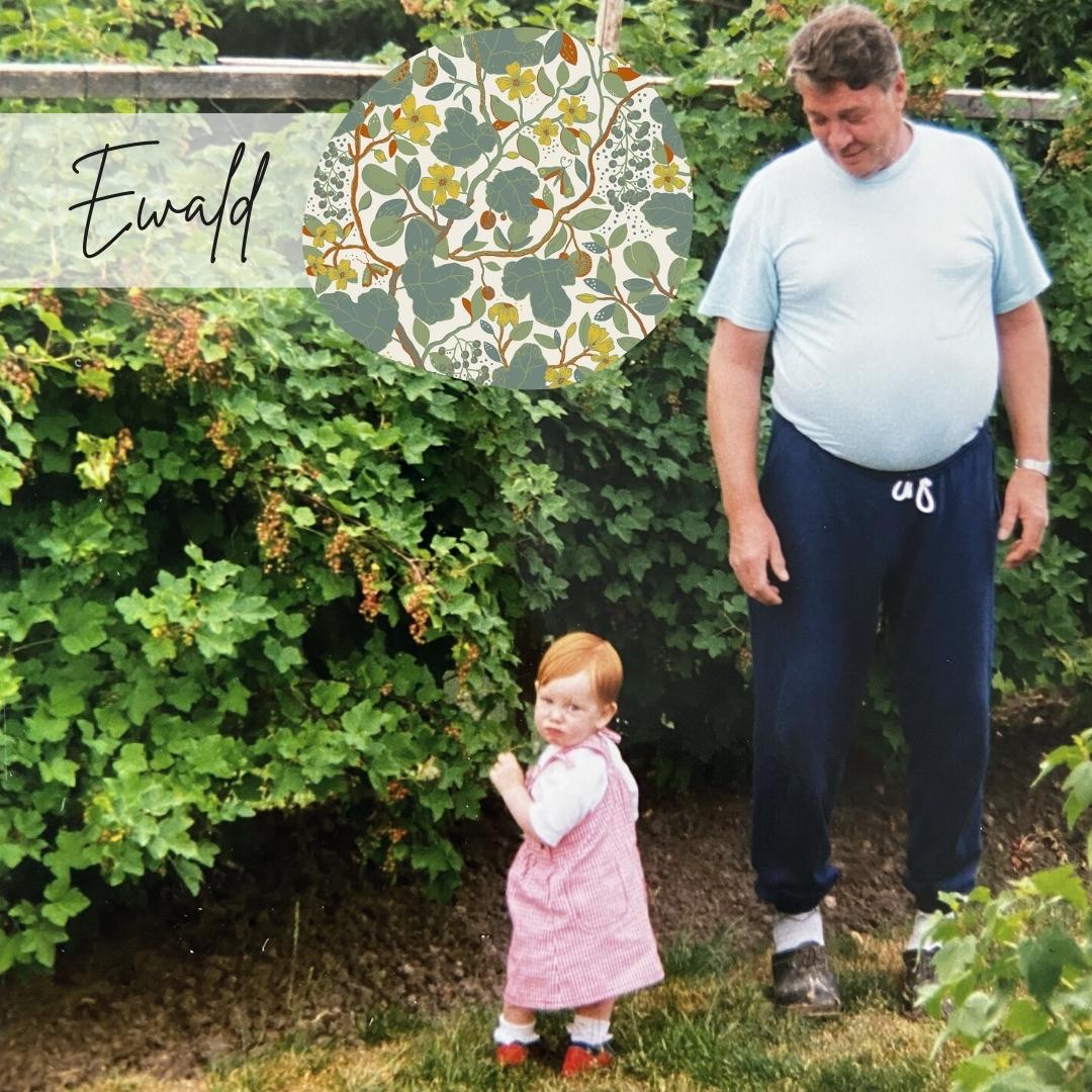 Ewald, min farfar och hans trädgård finns nära i minnet och har gett upphov till denna tapet. Grönsakslandet, vinbärsbuskarna och frukträden – allt skött med en omsorgsfull och varsam hand finns avbildat däri. I mönstret Ewald har jag återvänt till farfars lilla trädgård ute på ön Orust.