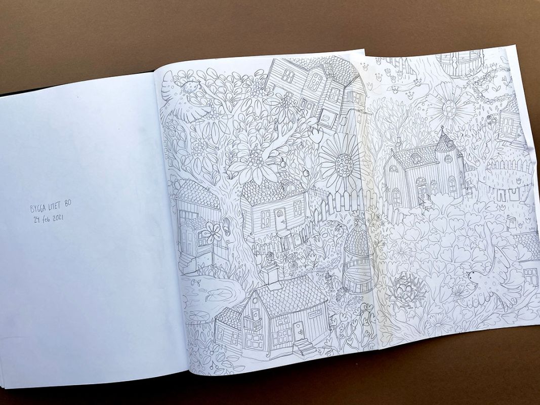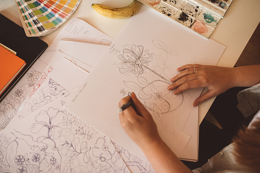 Att både jobba analogt och digitalt är en del av mitt arbetsätt när jag ritar mönster. Vanligtvis startar jag med en enklare skiss eller linjeteckning på A4 eller i mitt anteckningsblock. Jag försöker få en känsla för idén men struntar i själva mönsterrapporten. Detta sker vid senare tillfälle när jag tar in skissen i datorn. Där kan jag skala upp eller ner skissen – testa färger och känslan i mönstret i oändlighet, utan att behöva sudda eller göra om.