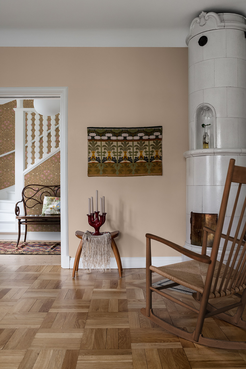 ”Tänk på helheten istället för rum till rum,” säger Björn. ”Om du har en väldigt färgstark tapet i ett rum ska inte nödvändigtvis alla de andra rummen ha det.” Komplettera istället dina färgglada och karaktärsstarka tapeter med mer nedtonade tapeter eller målade väggar.