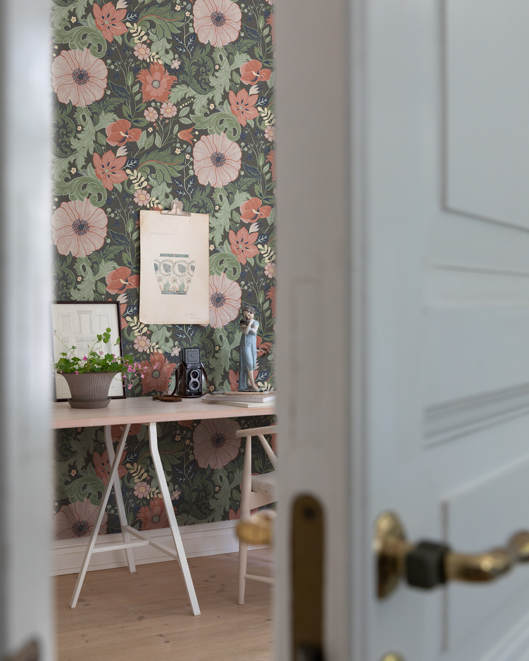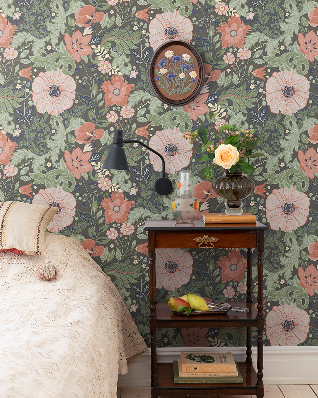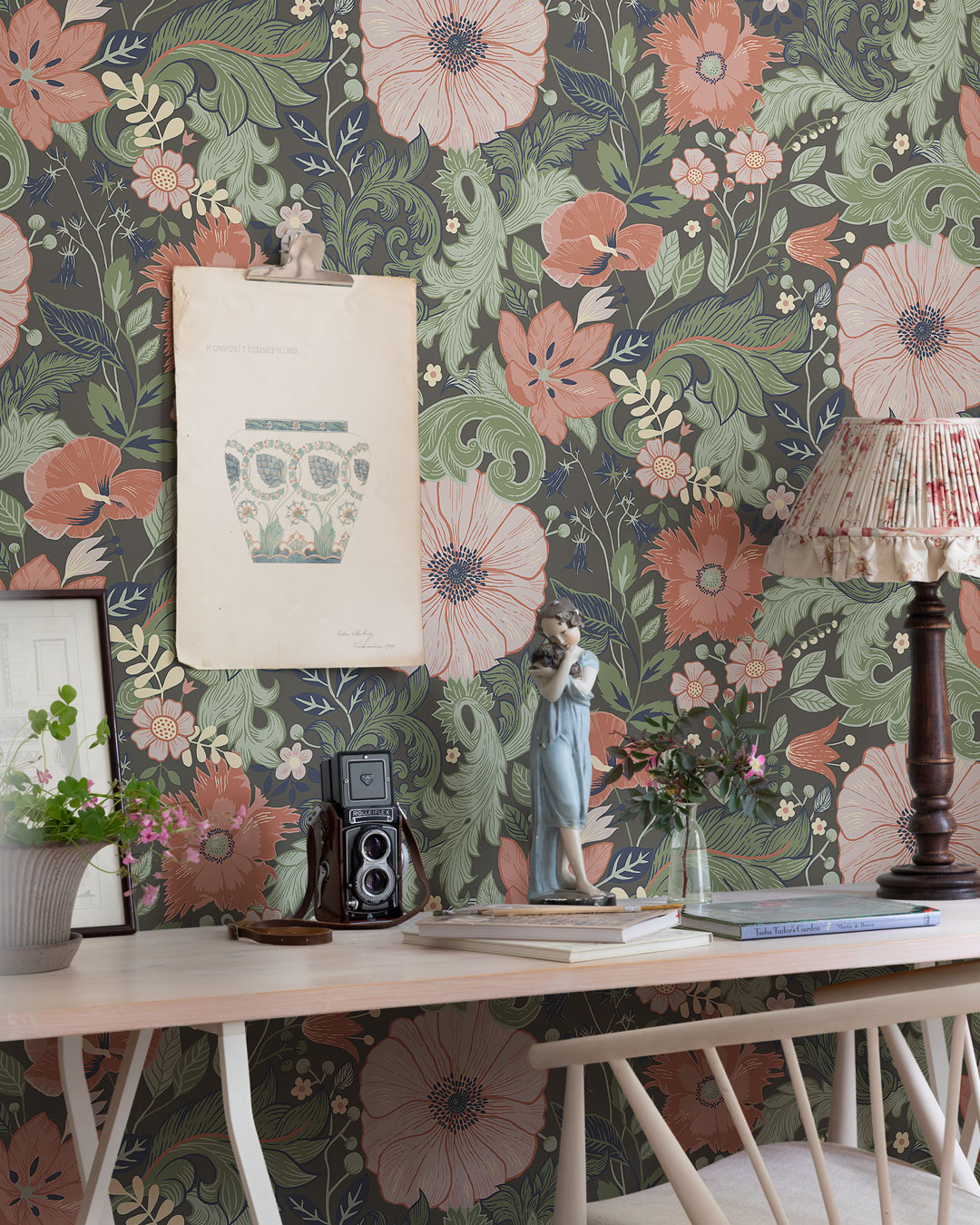 Vackra vallmotapeten Victoria väcker känslor till liv. Dröm dig bort bland vackert bladverk och rosa blomster som tar dig till en lummig trädgård. Med tapetens bruna botten får du ett mer djup i tapeten som sätter karaktär. Mönstret är ritat av Hanna Wendelbo och finns i fyra olika färgställningar.