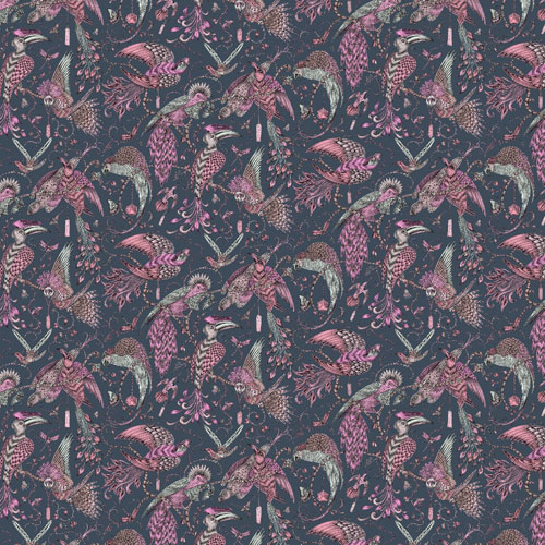 Låt den här populära tapeten få bli huvudkaraktären i ditt hem. Ett fabulöst mönster som gärna vill åt uppmärksamheten i hemmet. En mörkblå botten med exotiska fåglar i rosa, lila och grått. Tapeten heter Audubon Pink och kommer i tre andra färgställningar. Skapad av Emma J Shipley.
