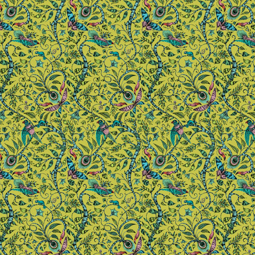 En tapet med en botten i en härlig gul nyans som får kreativiteten att sätta fart. Tapeten har ett vackert detaljrikt mönster av exotiska fåglar och insekter i nyanser av grönt, turkos och rosa. Denna färgbomb till tapet heter Rousseau Lime och blir en kär vän till hemmet. Finns i fler färgställningar.