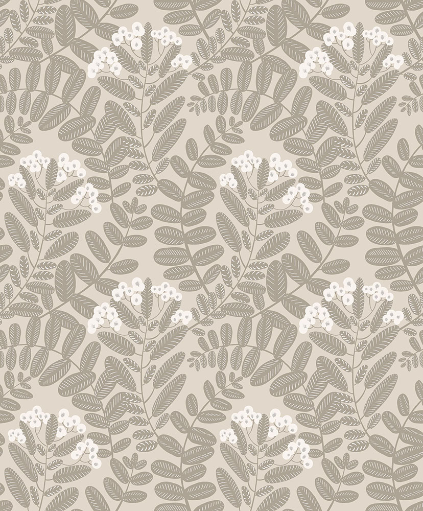 Tapeten Bodie bjuder in till härliga stunder med sitt stilrena mönster. Ett slingrande enkelt bladverk fångar in en bädd av vita små blommor. Bodie kommer i tre färgställningar, här med en beige botten.