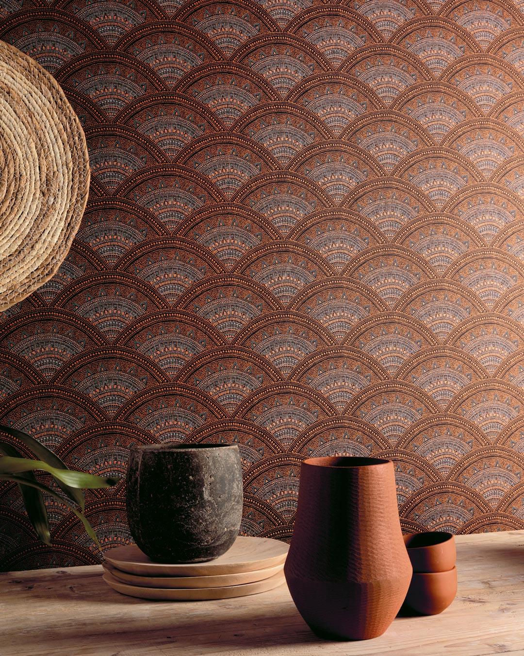 Bågformat mönster en färgstark orange och blå kulör på en mörk botten som får mönstret att tydligt att främträda. Med inspiration från hjärtat av staden Marrakech i Marocko skapar Callaia Spicy effektfulla uttryck på väggen.