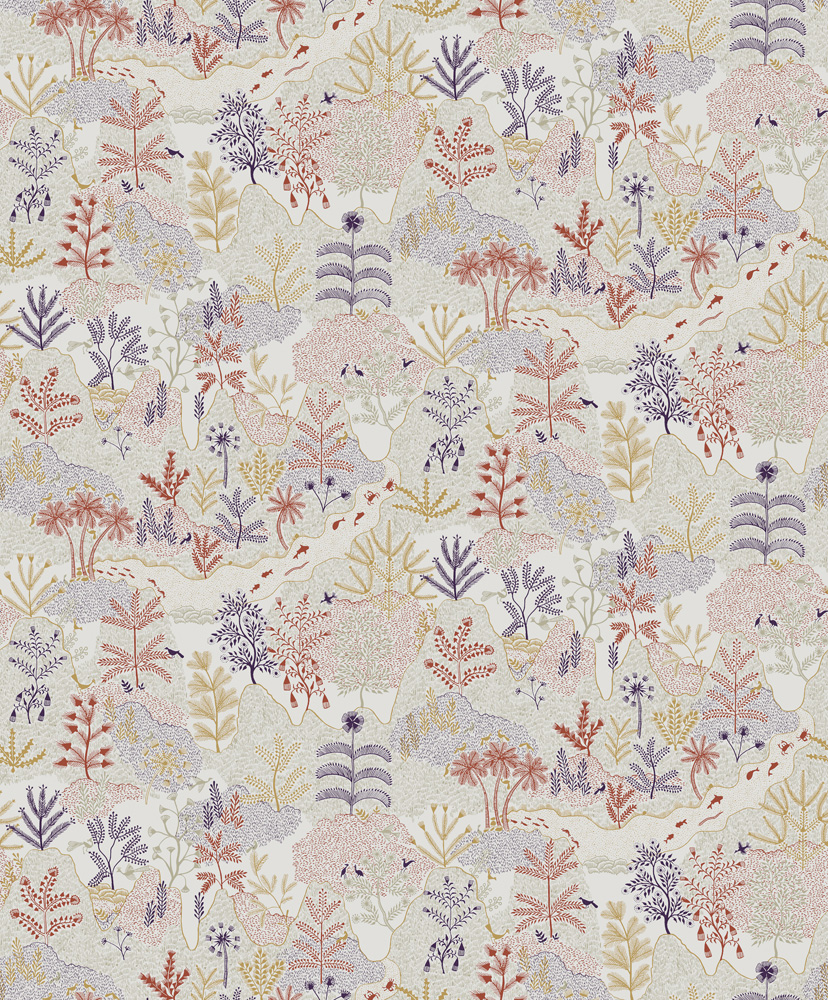 Paradiso Tamaki är en detaljrik tapet med en blandning av både vackra träd och vattendrag fulla av levande sjödjur. Med sina ljusa diskreta botten får mönstret framträda med klara färger av havregult, grönt och lila. Tapeten finns i åtta väl genomtänkta färgställningar, beställ hem prover för att hitta just din favorit.