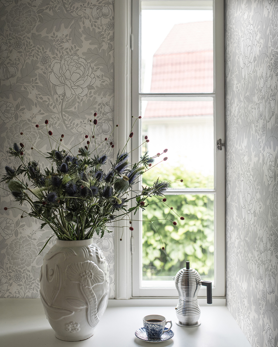 Klassisk vit storblommig tapet som omfamnas av en blandning av gråa blad. Denna neutrala tapet ger dig stor flexibilitet med din inredning, fyll på med sprudlande färger eller håll dig till en minimalistisk och modern färgpalett. Mönstret vi ser på bilden heter Camille och kommer i 5 färger.