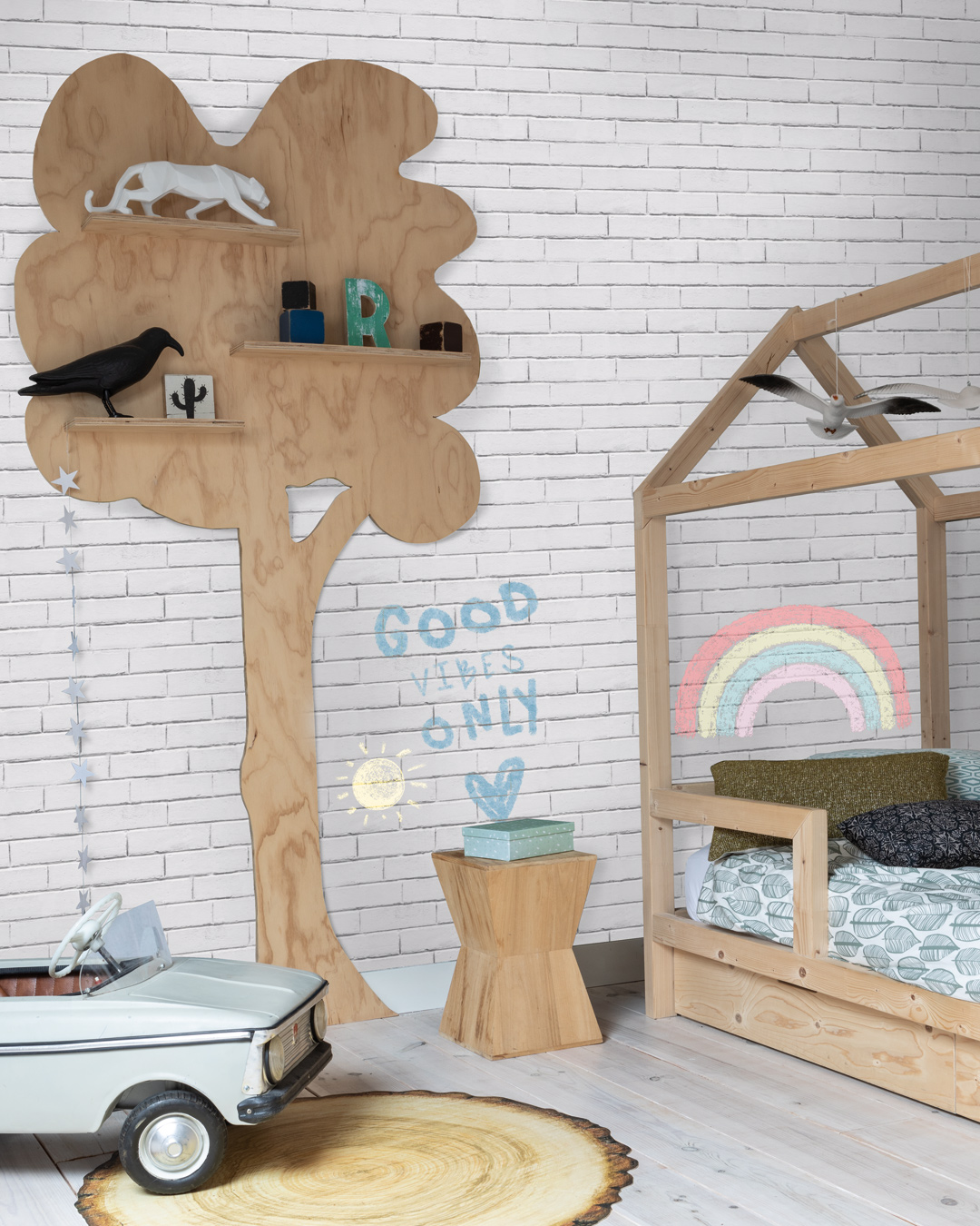 Nöje utan skada. Här kan barnen få utlopp för deras kreativitet om rita fritt på väggarna med krita. Du återställer enkelt väggen till en snygg tegelvägg efter mini Picasso är klar. Ljusgrå (nästan vit) tapet med tegelmönster och griffeltavelyta, helt tvättbar!
