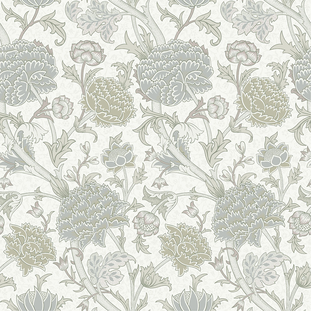 På växande stänglar skjuter pionerna i höjden längs väggarna med tapeten Cray. Det blir frodigt och lummigt när små söta blommor i ljusgrått som täcker den vita botten möter det kraftfulla pionerna i olika nyanser av grått och beige. En grågrön kontur bygger långsamt upp växtlighetens blad och stjälkar. Inspirationen kommer från floden Cray som slingrar genom den pittoreska byn Kent i Storbritannien, dess lugna skönhet inspirerade William Morris till att skapa denna effektfulla design 1884.