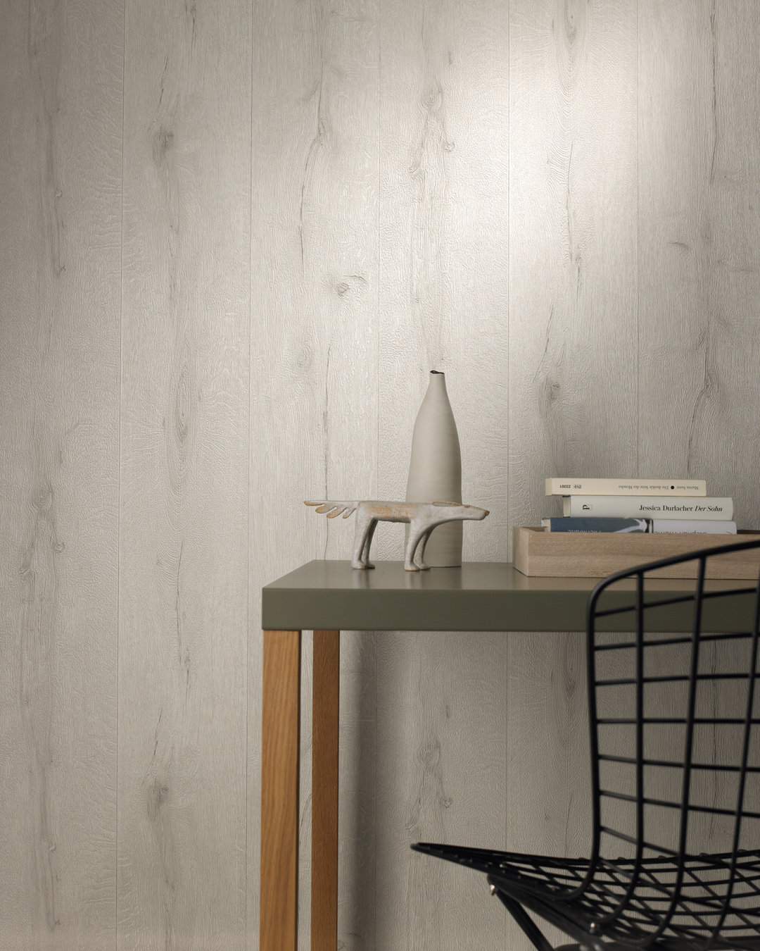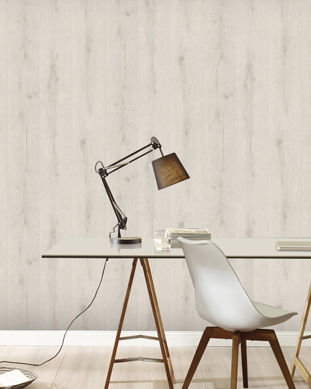 Ska du sätta upp träpanel inomhus? Gör det enkelt för dig och använd tapet. Precis som träpanel kan tapeten monteras både lodrätt och vågrätt, helt efter tycke och smak. Här ser du en vit trätapet som efterliknar vackert plank i ask eller vitpigmenterad ek.