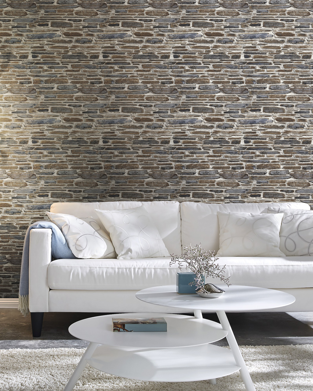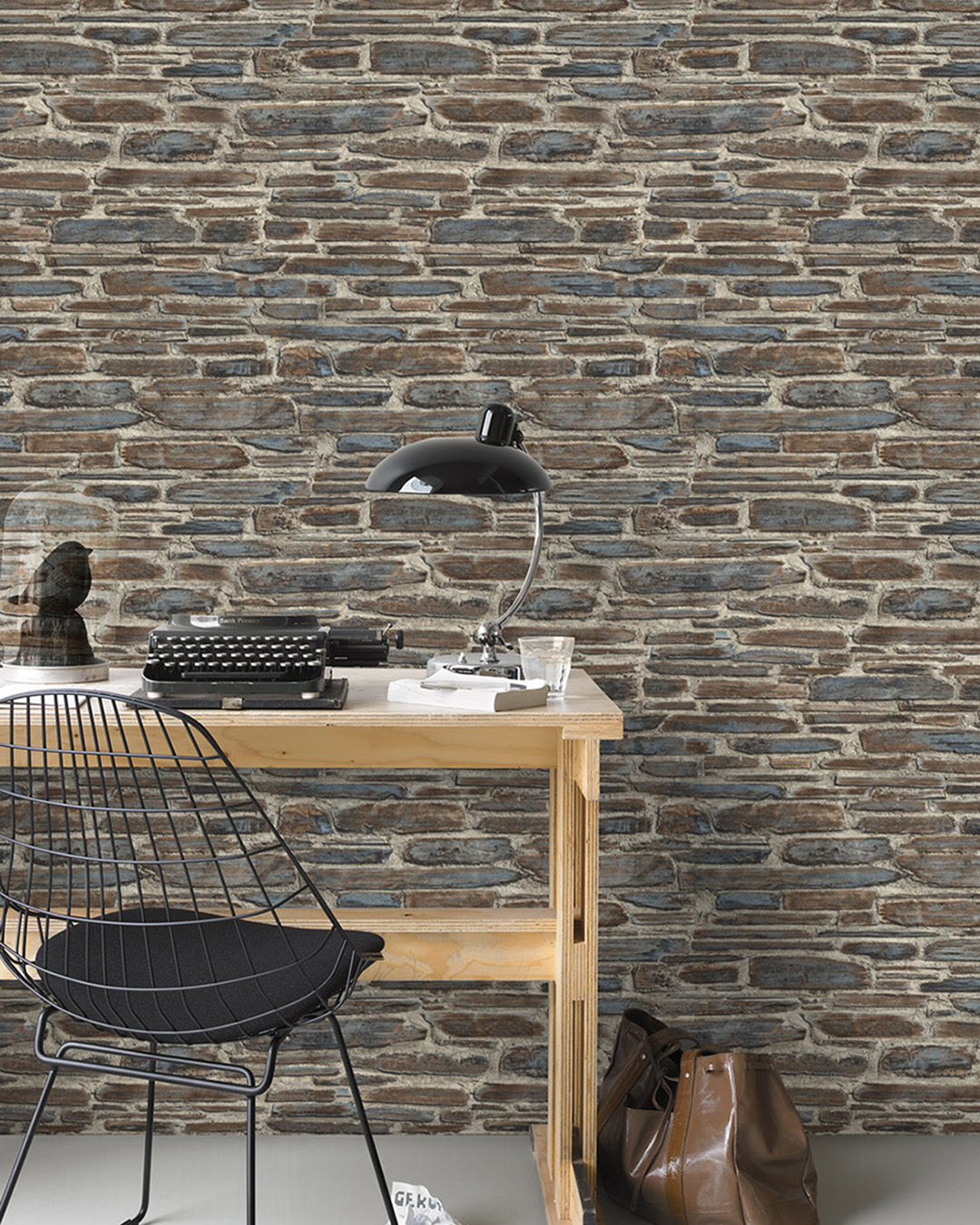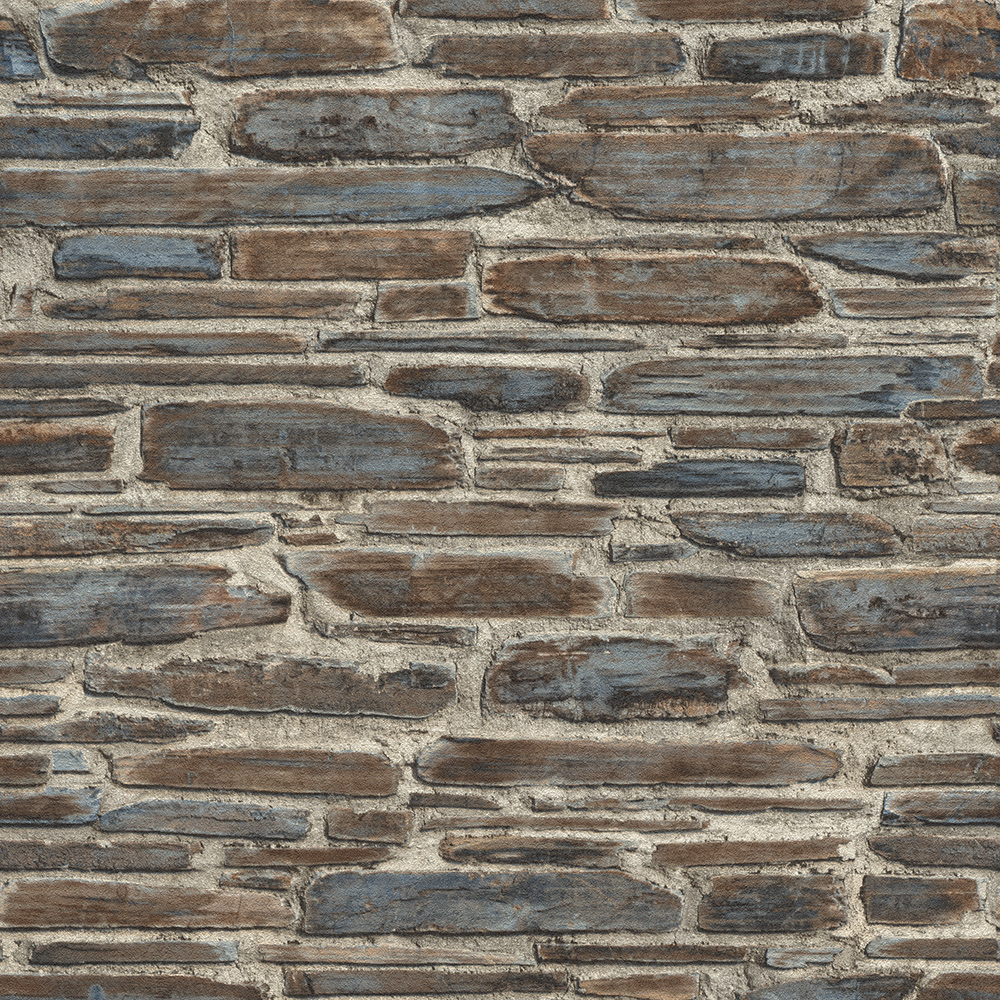 Stenmönstrad tapet i brunt och blått med rektangulära block i osymmetriskt utförande. Med tegel i svalare undertoner har du nära till den rustika och industriella stilen. En universal tapet som gör sig bra i både en butik, kök och sovrum.