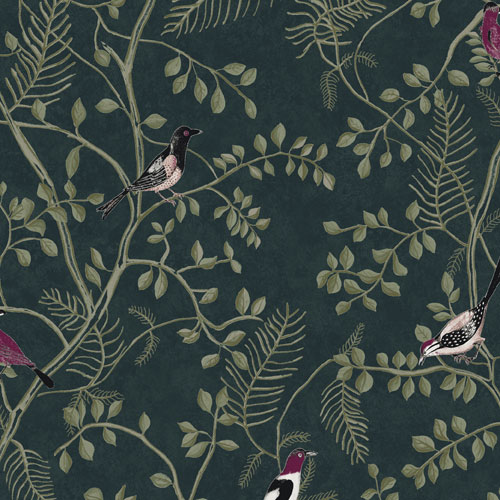 En mörk tapet med slingrande grenar i grönt och färggranna små vackra näktergalar som sjunger i kör. Nightingale Ivy för tankarna till solens värmande strålar och trädens yviga gröna blad. En fin tapet som finns i sex noga utvalda färgställningar.