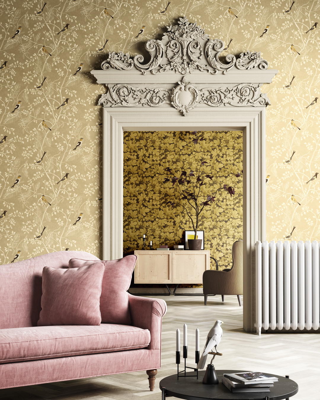 Brun tapet med ljusa grenar som agerar perfekta viloplatser för den färggranna näktergalen. Här tar den tillfälle för en sångstund innan den flyger vidare på nya äventyr. Nightingale Sand är en stilrent tapet med fåglar som passar i barnrummet så väl som vardagsrummet.
