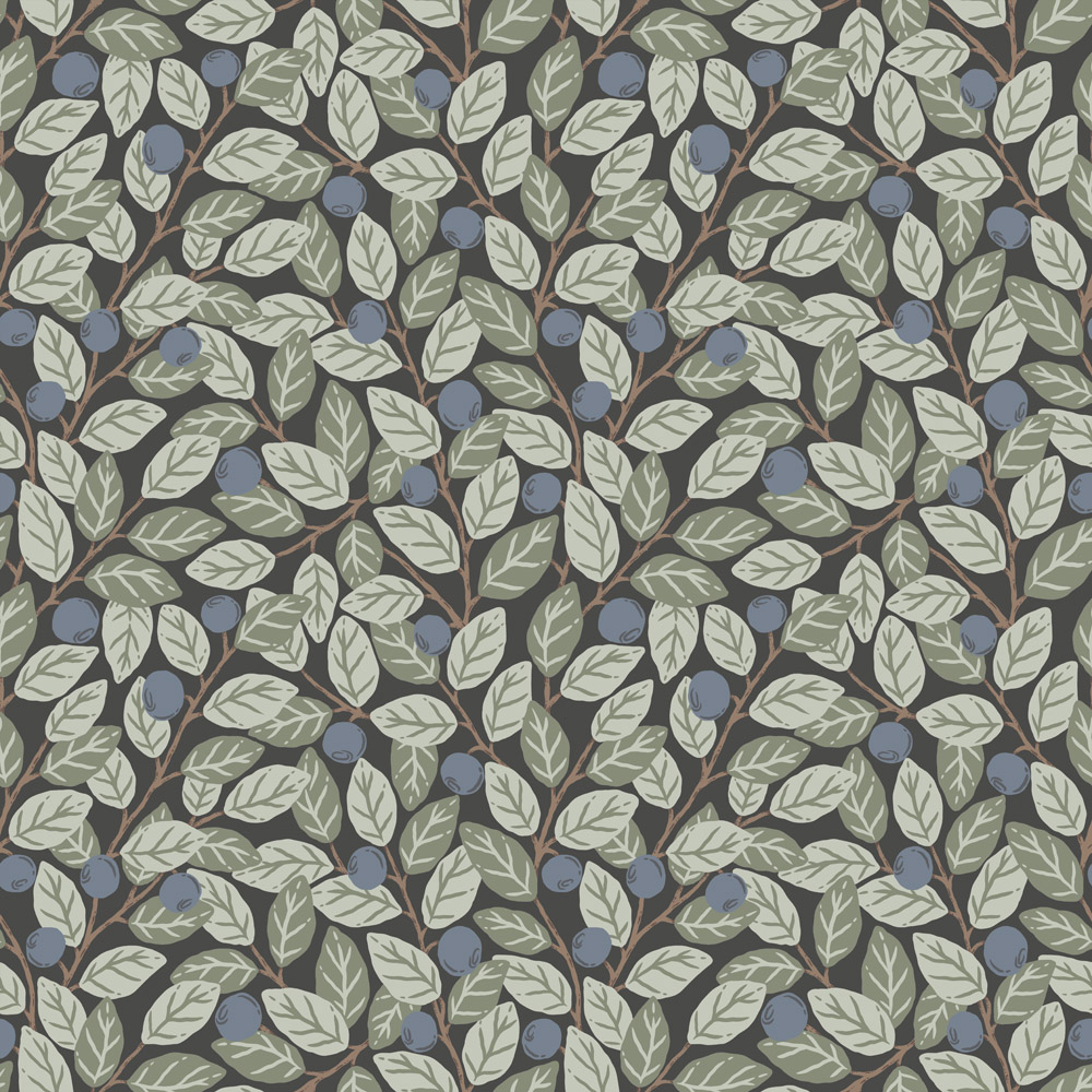 Det frodiga blåbärsriset skapar ett himmelskt bärtäcke och tapeten Blåbär ser till att hemmet alltid präglas av ren blåbärsmysteri. Här ser du tapeten i en uttrycksfull färgskala i blått och grönt mot svart botten.