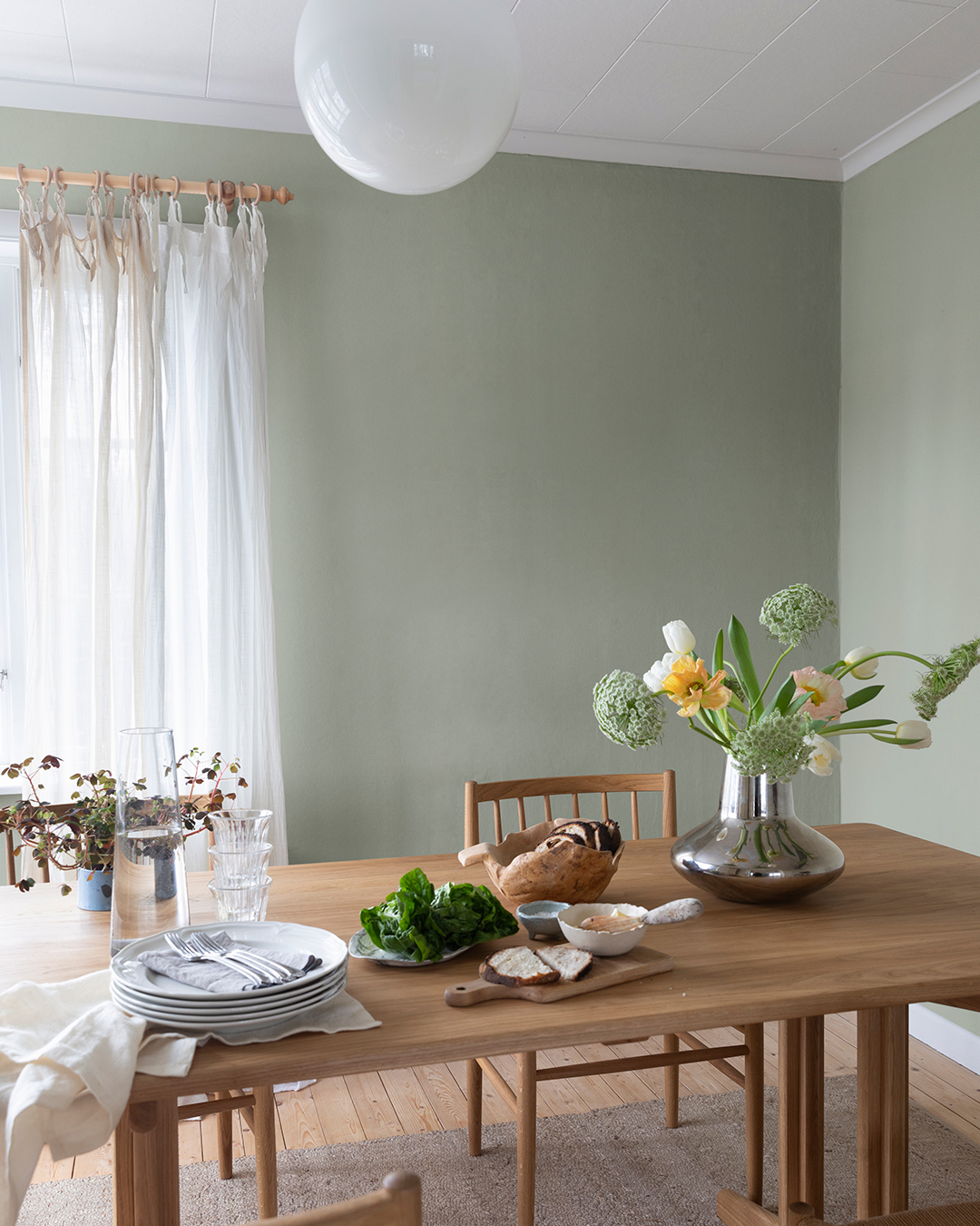 Likt en disig daggvåt morgon när morgondimman mjukar upp och dämpar naturens alla kulörer, och en vacker stillhet råder, skapar tapet Mint ett svalt och rofyllt rum. En ljusgrön enfärgad tapet med toner av grått som ger en behaglig känsla i rummet. Tapetens matta yta med lätt melerad struktur adderar ett sofistikerat intryck.