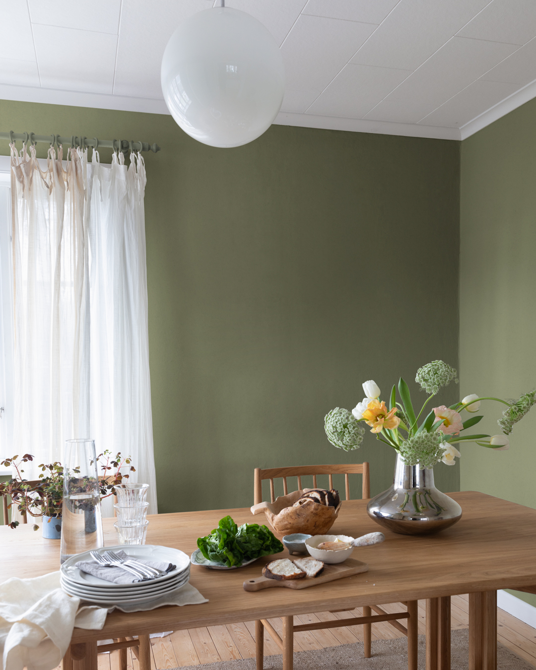 Skog är en mustig och varm mörkgrön enfärgad tapet som ger rummet karaktär. Med en mörk tapet är det enklare att skapa ett ombonat rum där känslan kan förstärkas ytterligare med mörk inredning eller ljusas upp med ljusa träslag, textil och mattor.