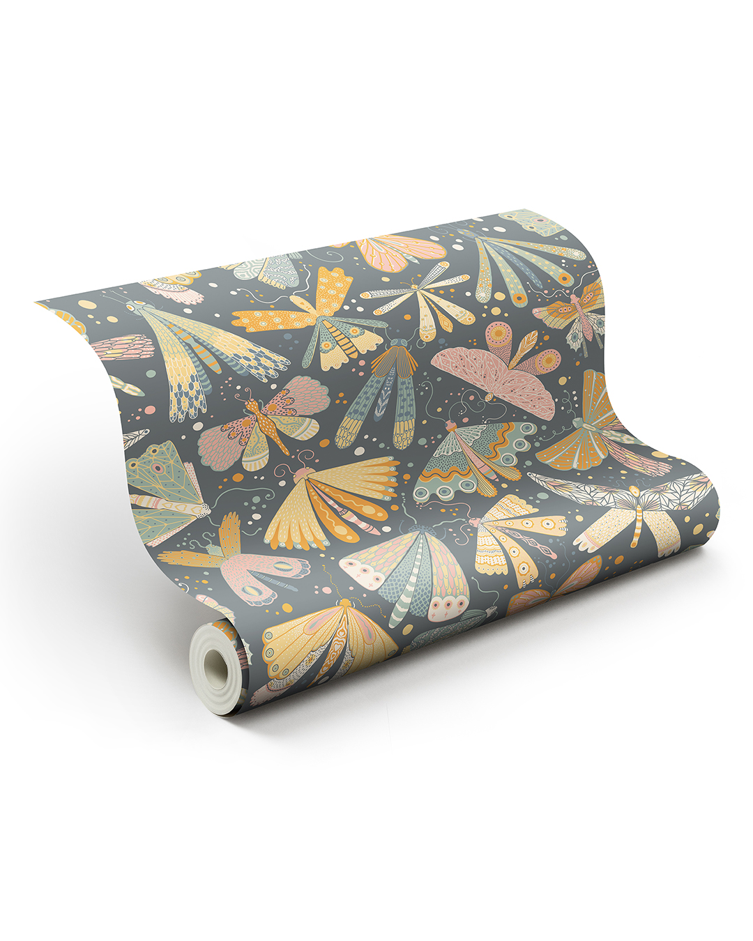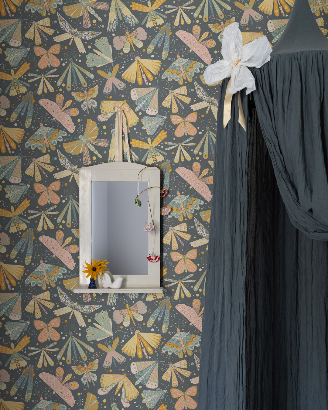 Med barntapet Flyga kan du skapa en lekfull oas för ditt barn. Flygande fjärilar och sländor dansar fram längs väggarna i en behaglig färgställning av rosa, pigga nyanser av gult och orange samt olika nyanser av blått. Ett barnrum där fantasin får flyga fritt tillsammans med dessa vackra och detaljrika vingburna små djur.