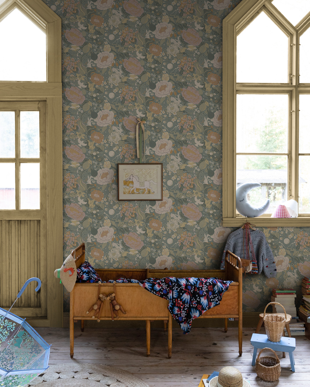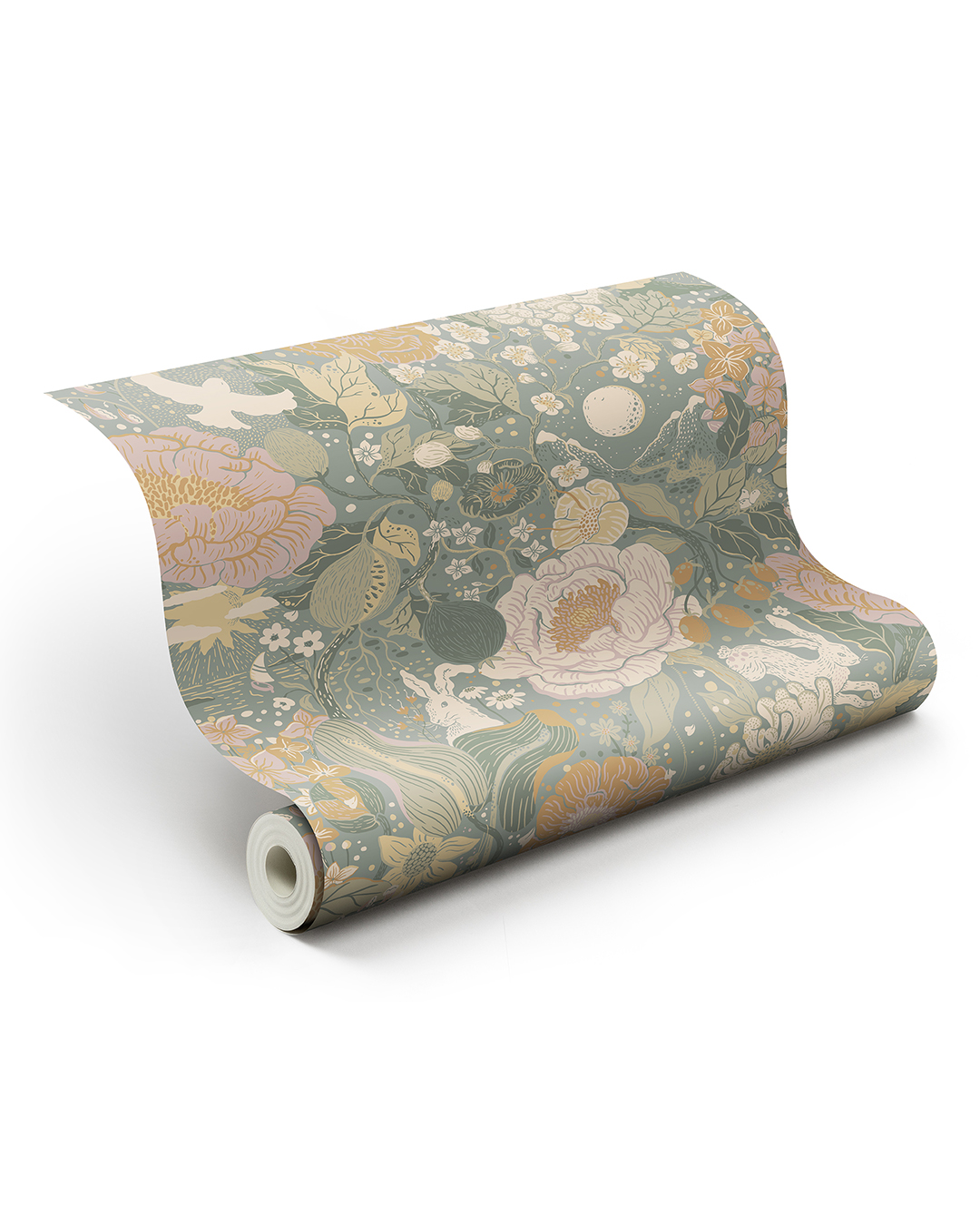 Vandra tillsammans längs den månupplysta stigen eller segla iväg tillsammans mot nya äventyr i solnedgången. Med barntapet Växa kan du och ditt barn förflytta er till vackra sagovärldar och låta fantasin flöda. Magnifik växtlighet i form av nyponrosor, körsbärsblom och kaprifol får sällskap av djur och trolska miljöer. Tapetens färgställning med nyanser av blågrå, rost, grönt och rosa skapar ett mysigt och ombonat barnrum.