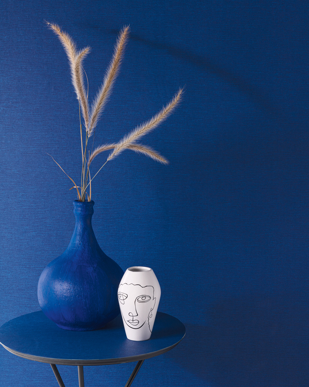 Tapeten Gini Cobalt har en härlig djup kornblå nyans. Upplevs som enfärgad på håll, men har ett diskret vågrätrandigt mönster av ljusare blå nyans om man går närmre. En tuff och modern färg.