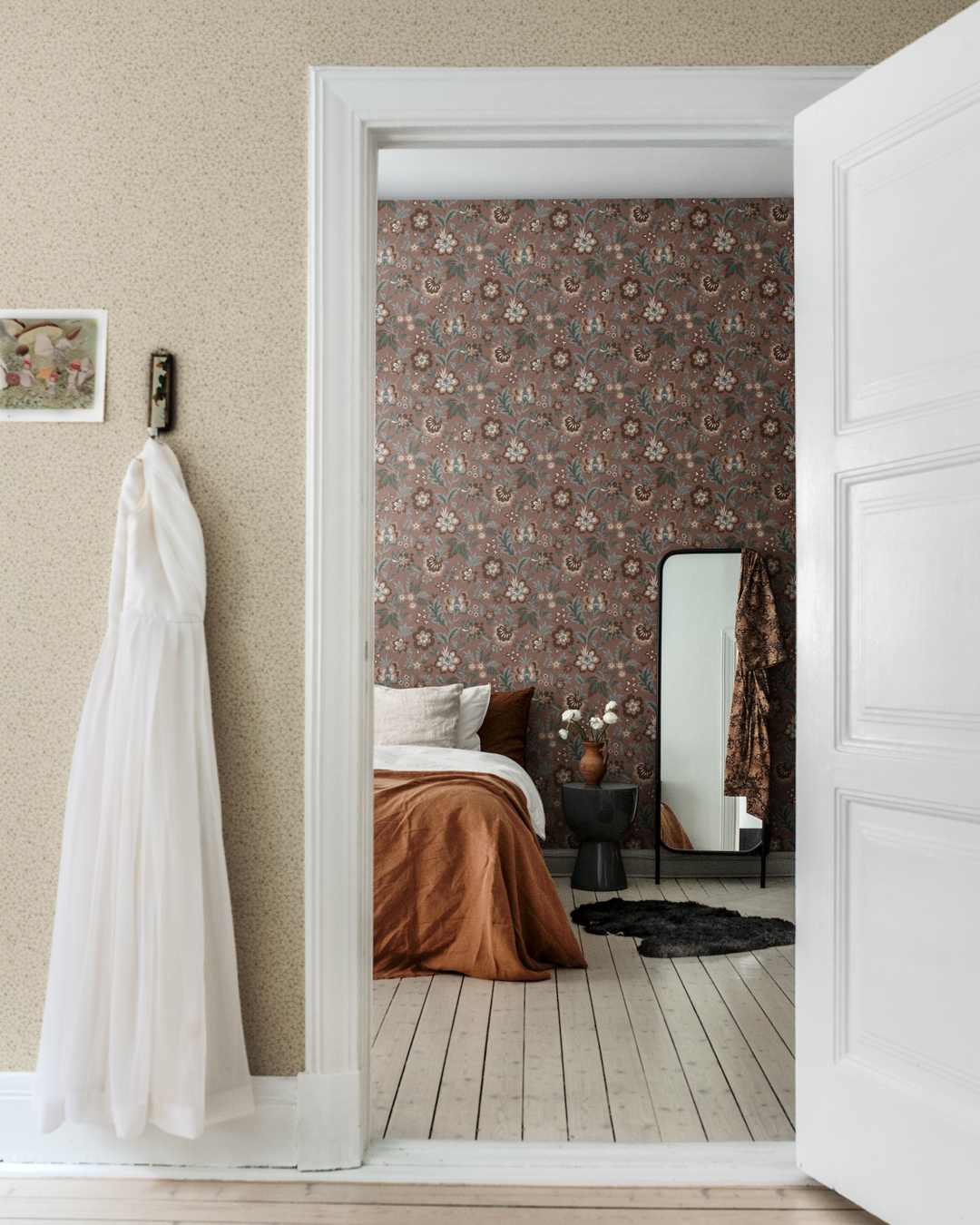 Ett klassiskt blommigt tapetmönster där blommorna och bottenfärgen delar lika på uppmärksamheten. Mönstret Mirabelle finns i 5 varianter varav detta är ett utav de dovare och mörkare färgställningarna. Detta är en brun tapet som skapar en mysig ombonad känsla i både sovrum, hall och vardagsrum.
