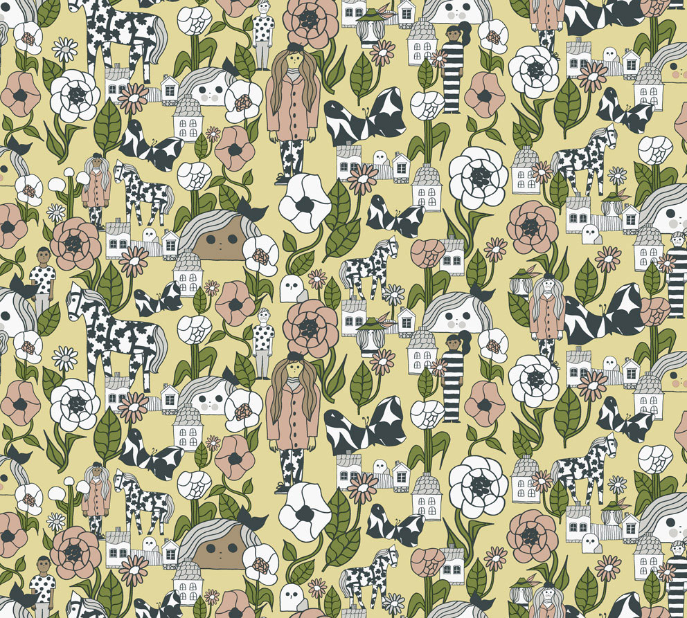 En gul tapet möts av behagliga färgkombinationer i form av en dämpad rosa, frodig skogsgrön samt gråa och vita figurer. Tapeten utstrålar glädje och livfullhet med dess alla detaljer blir den en utmärkt fondvägg likaväl i barnrummet som i resten av hemmets rum.