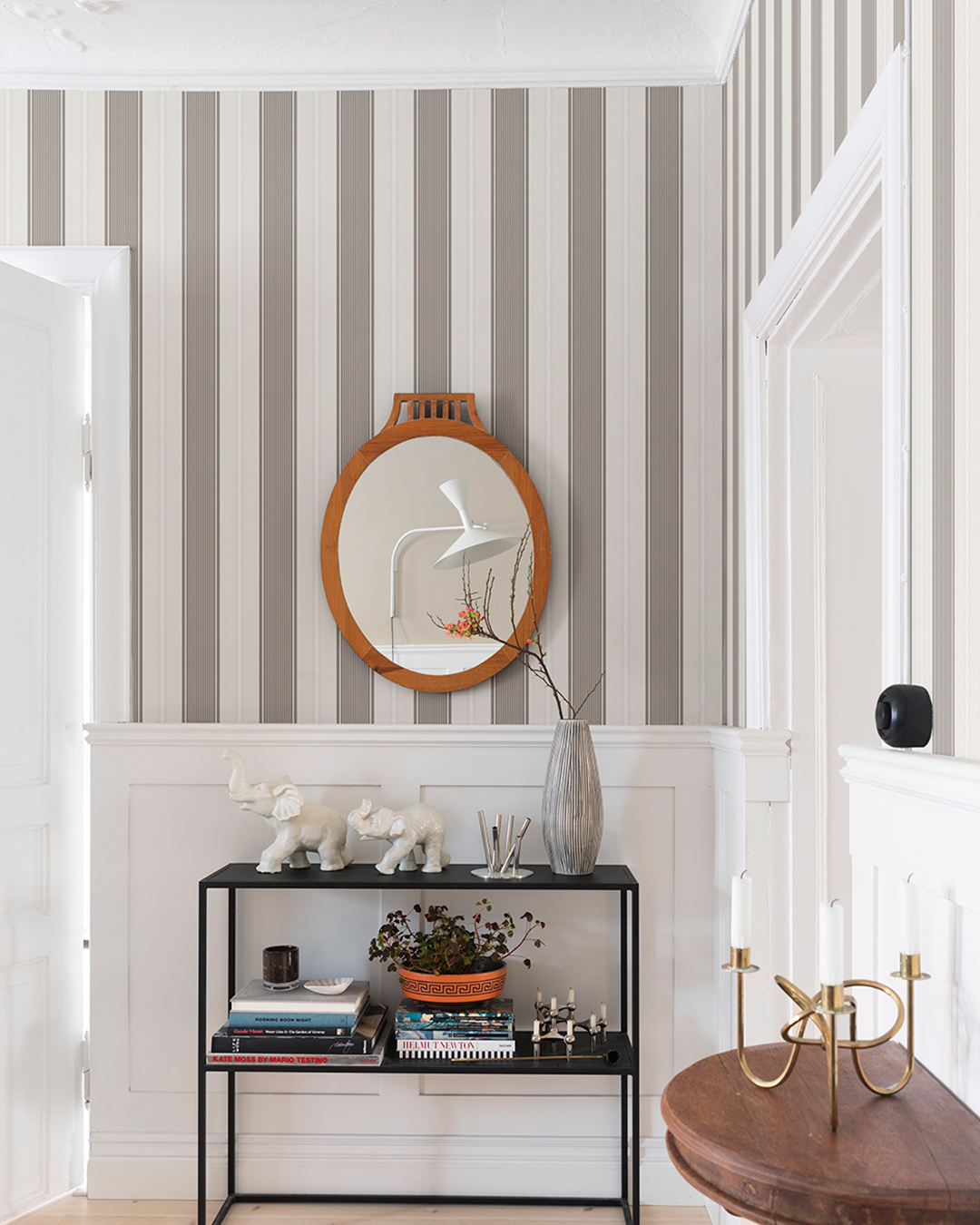 En randig tapet har ett välbekant mönster som återfinns i många hem och som aldrig går ur tiden. Mönstret Fred är en sofistikerad rand som passar både det moderna och det lantliga hemmet. Denna brungrå färgställning med ljusare och mörkare ränder adderar värme till rummet och skapar en stilren känsla.
