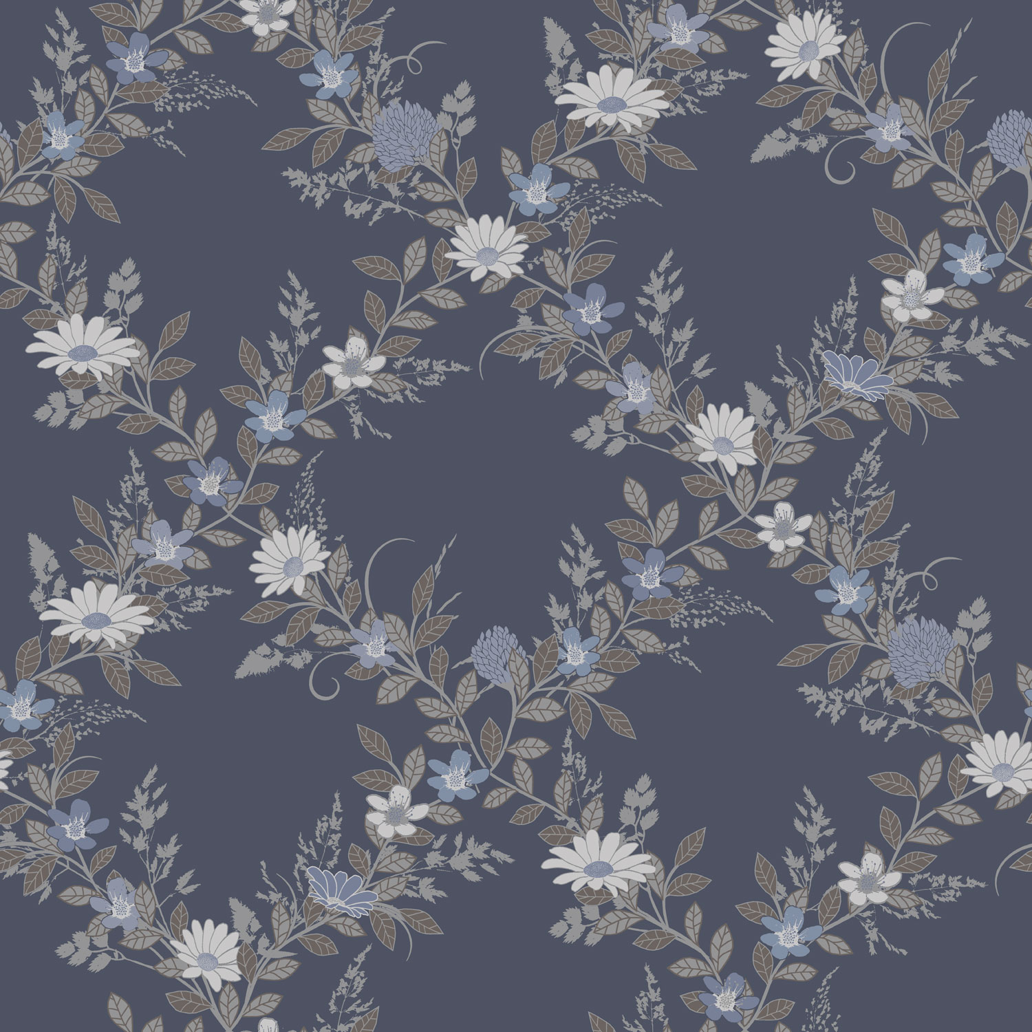 I behagligt blått kommer trellistapet Margareta och påminner oss om den blomstrande sommaren. Gräs och blommor flätas samman till ett mjukt rutmönster i olika nyanser av blått, brunt och grått. Den dova blå bottenkulören ger rummet ett lugn samtidigt som mönstrets ljusare nyanser ger liv åt väggarna.
