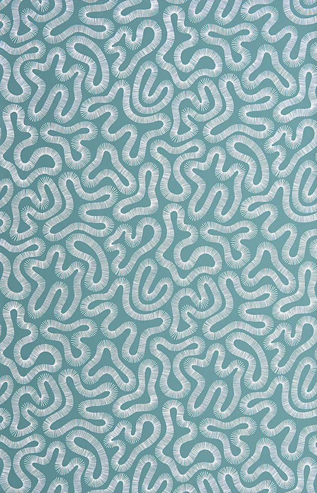 Här har vi en tapet som ger rätt retrokänsla. Coral Teal är ett mönster inspirerat av koraller och det labyrintliknande mönster som finns i våra hav. Ett linjearbete som ger en detaljerad tapetdesign. Tapeten har en grönblå botten och ett mönster i vitt. Samma tapetmönster finns i fem olika färgställnignar.