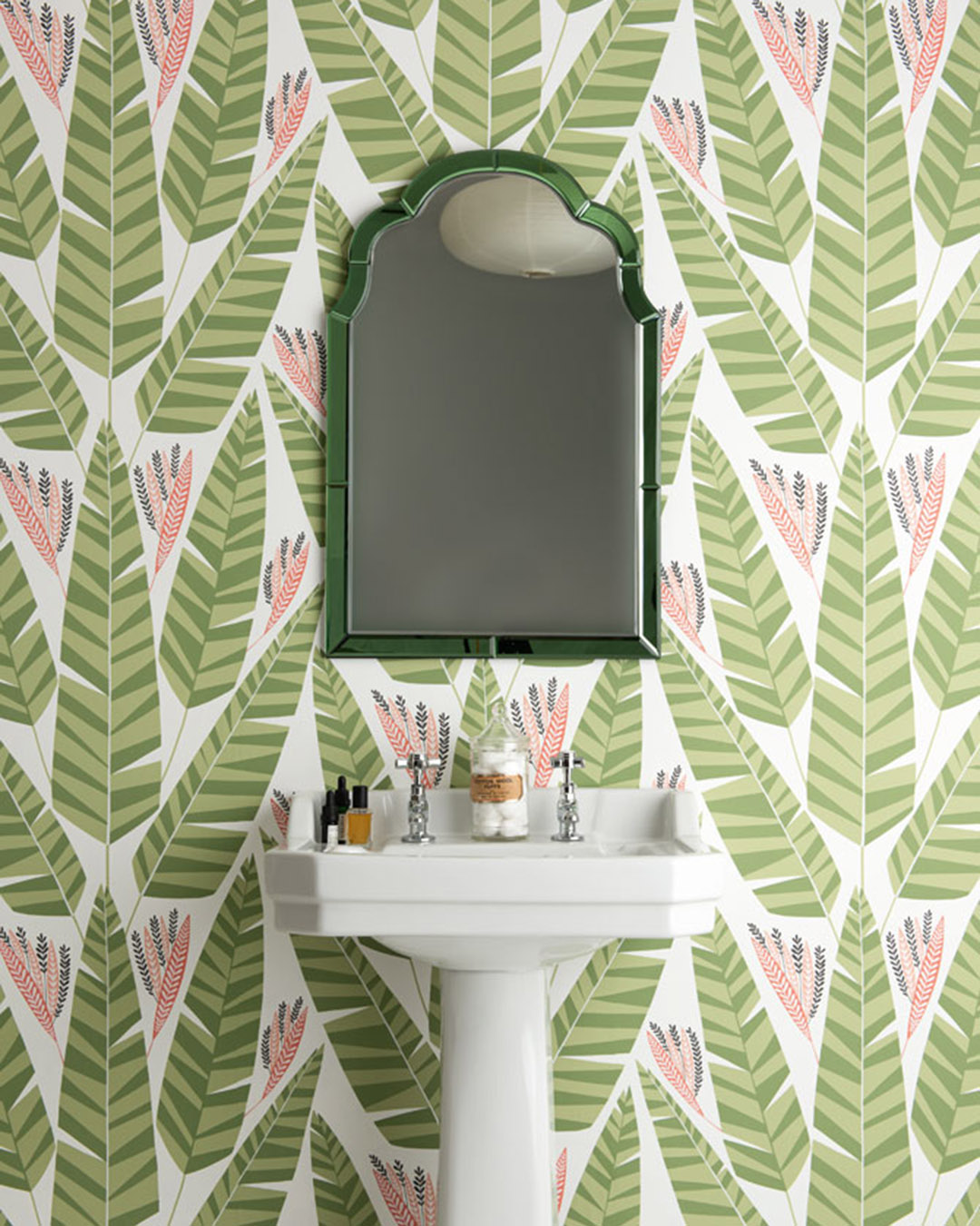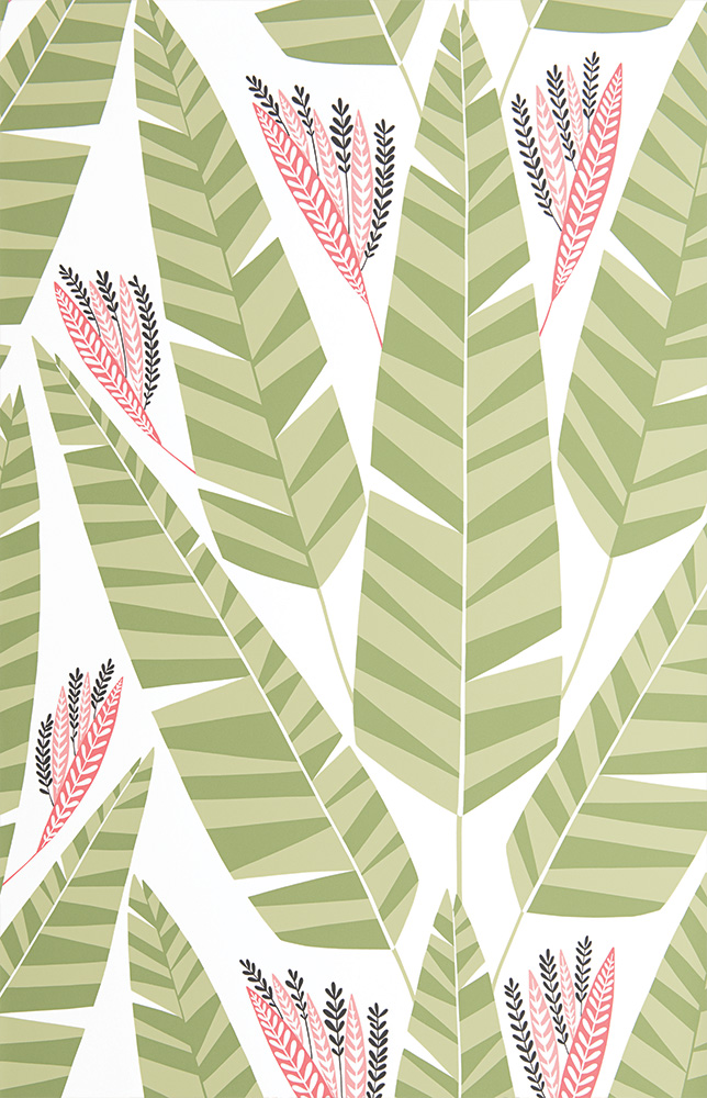 Tapeten Jungle Palm är inspirerad av den stora tropiska bananväxten. De gröna sköldliknande bladen möter blommor som går i nyanser av svart, rosa och persika. Tapeten har en vit botten. Jungle Palm finns i tre olika färgställningar och är den perfekta tapeten för ett rum i retrostil.