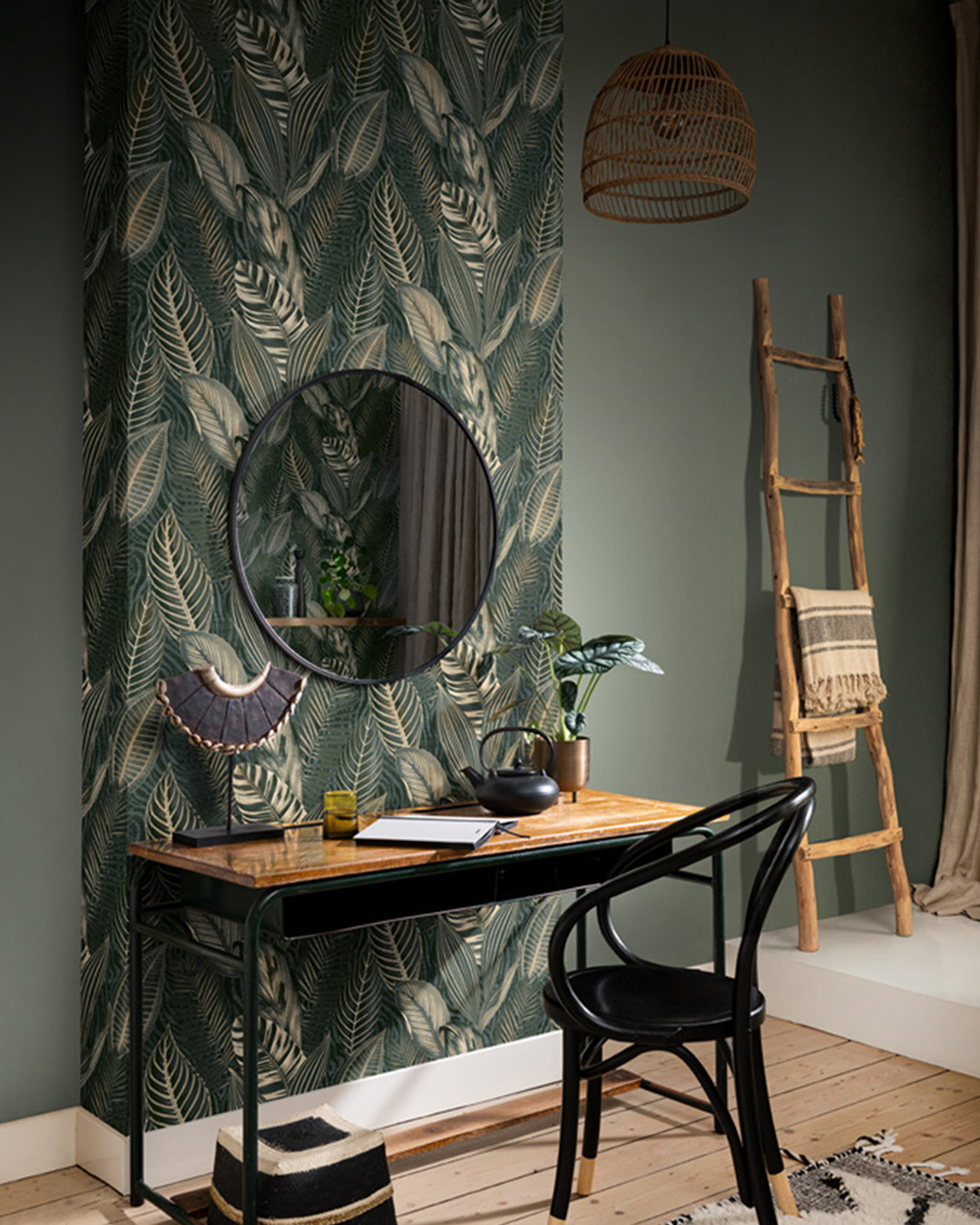 Inred med den trendiga gröna paletten för en trivsam atmosfär i tropisk anda. Denna unika tapet med läderimitation sprider en härlig värme tack vare sin olivgröna nyans. Kombinera tapeten bruna toner och koppar för en harmonisk helhet.