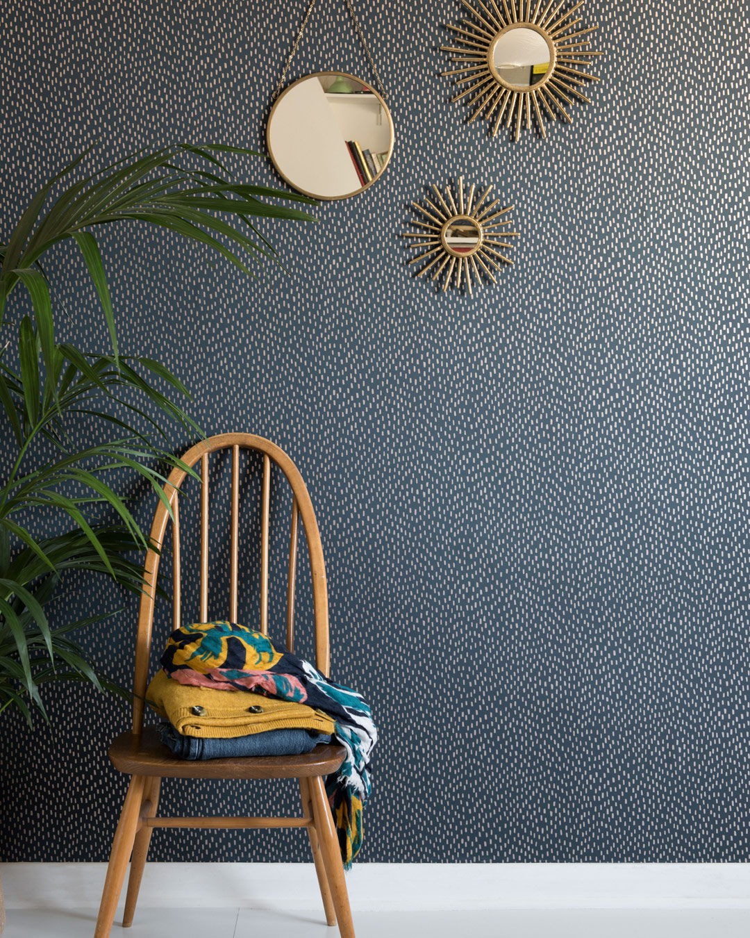Modern mörkblå tapet med lodräta silverstänk, detta är defenitionen av en lyxig minimalistisk design. Mono är ett mönster från tapetleverantören Miss Print som tagit fram deras tolkning på en blinkande stjärnhimmel. De reflekterande sträcken skapar subtil liv och rörelse till dina väggar.