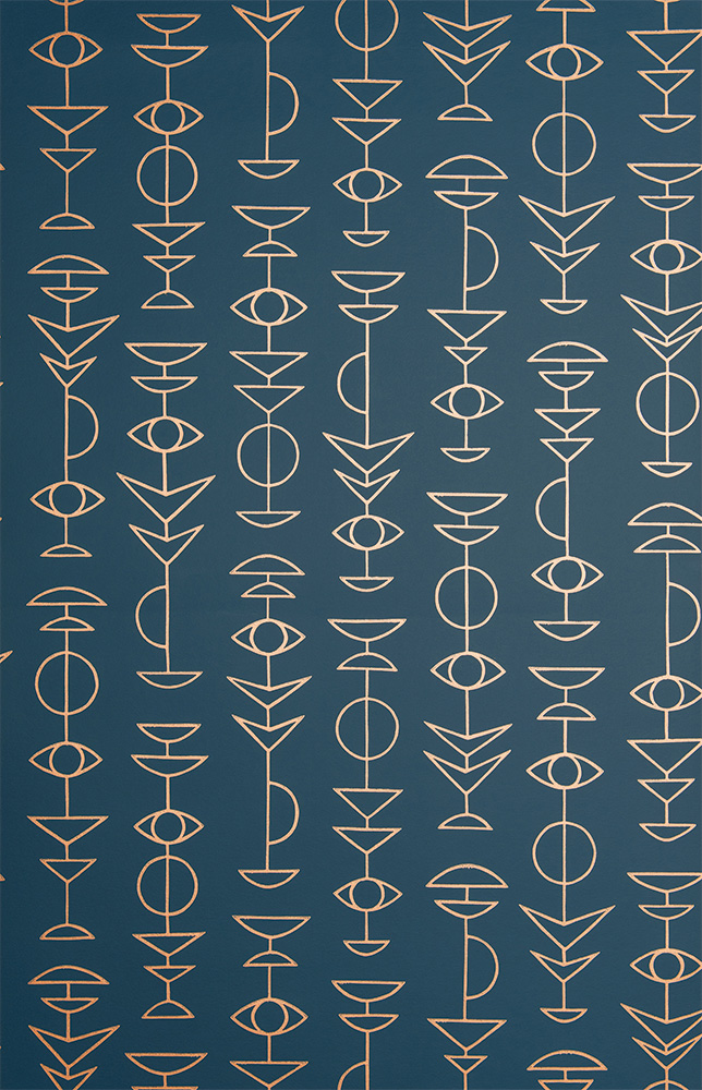 Inspirationen har designern hämtat från geometri, elementära former och uråldriga symboler. Mönstret skapar en härlig struktur till rummet. En mörkblå geometrisk tapet med ett lodrätta kopparfärgade symboler sprider en varm och ombonad känsla till ditt sovrum, kök eller vardagsrum.