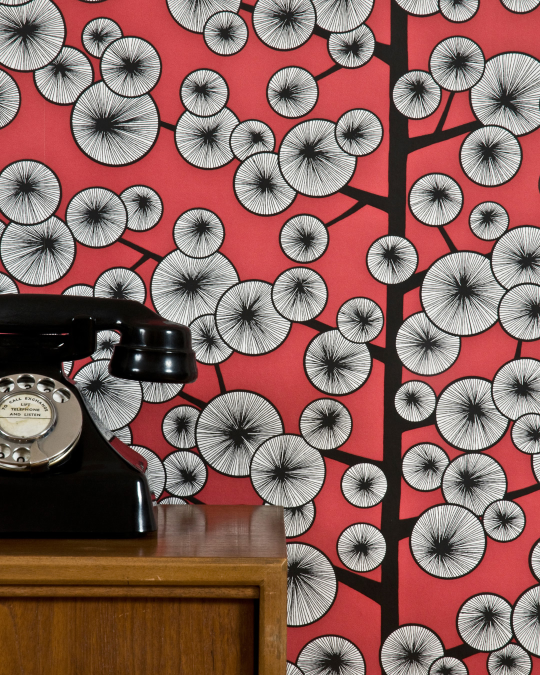 Roligt med retro! En röd tapet med stiliserade bomullsträd i retrostil med influencer från japan. I mönstret Cotton Tree ser vi ett svartvitt träd där designern har lekt med geometriska former på ett sofistikerat sätt. Mönstret finns i tre effektfulla färger, från kollektionen Signature.