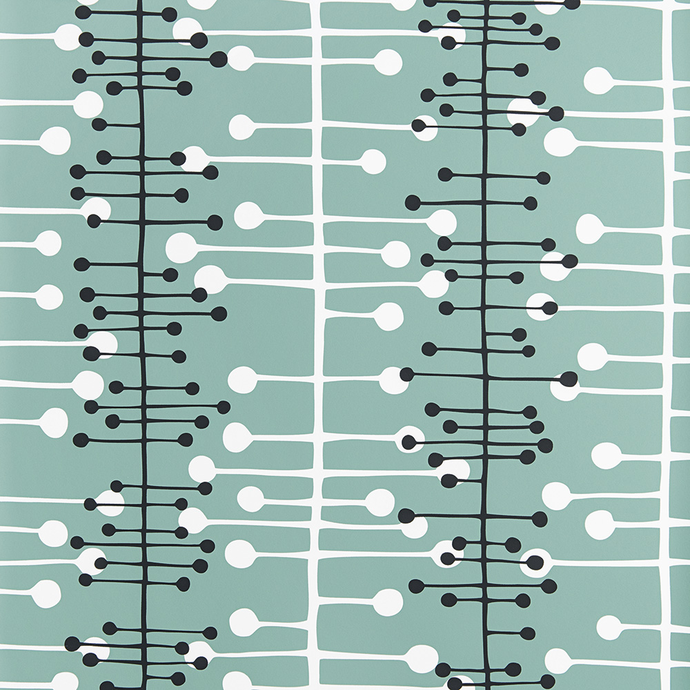 I mönstret Muscat Lovat har man valt att ge nytt liv till klassiska vintageformer. En turkos tapet med ett abstrakt organiskt mönster i vitt och svart föddes ur vetenskapsbaserad atomdesign från mitten av 1900-talet. Former som stiger och växer från smala vertikala stjälkar.