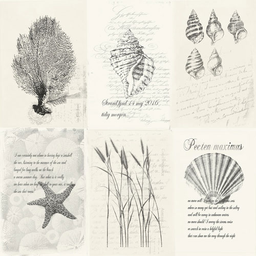 Ett romantiskt svartvitt mönster av strandnära fynd av snäckor och vass på en ljus botten. För minnena tillbaka till sommarens promenader på stranden och de ljuvliga dofterna, vinden och vattnets lugna kluckande.
