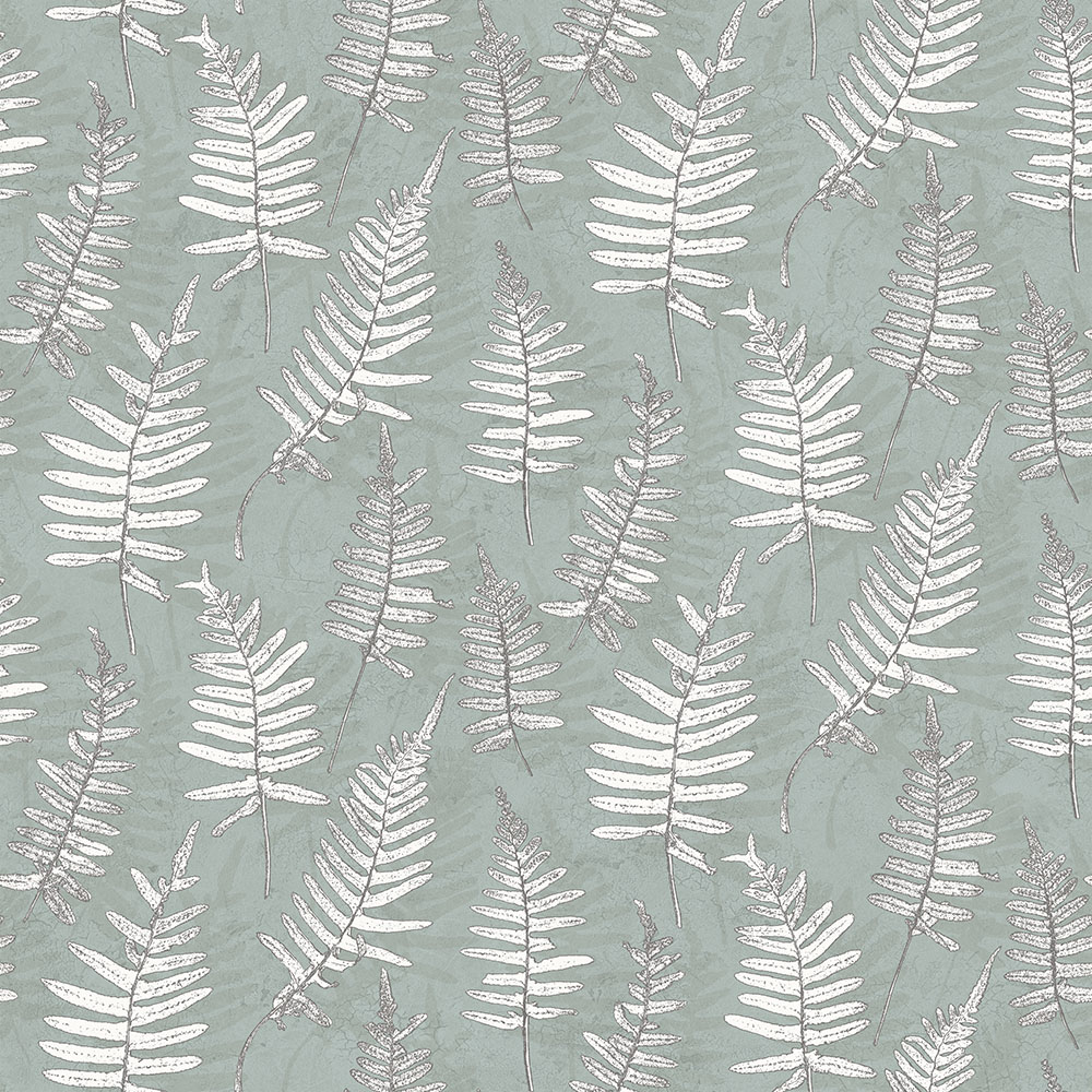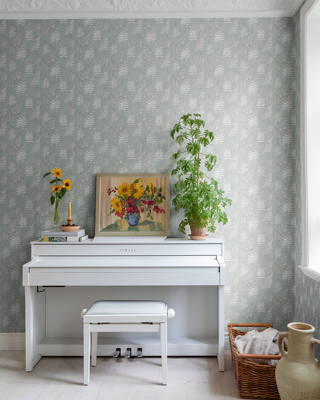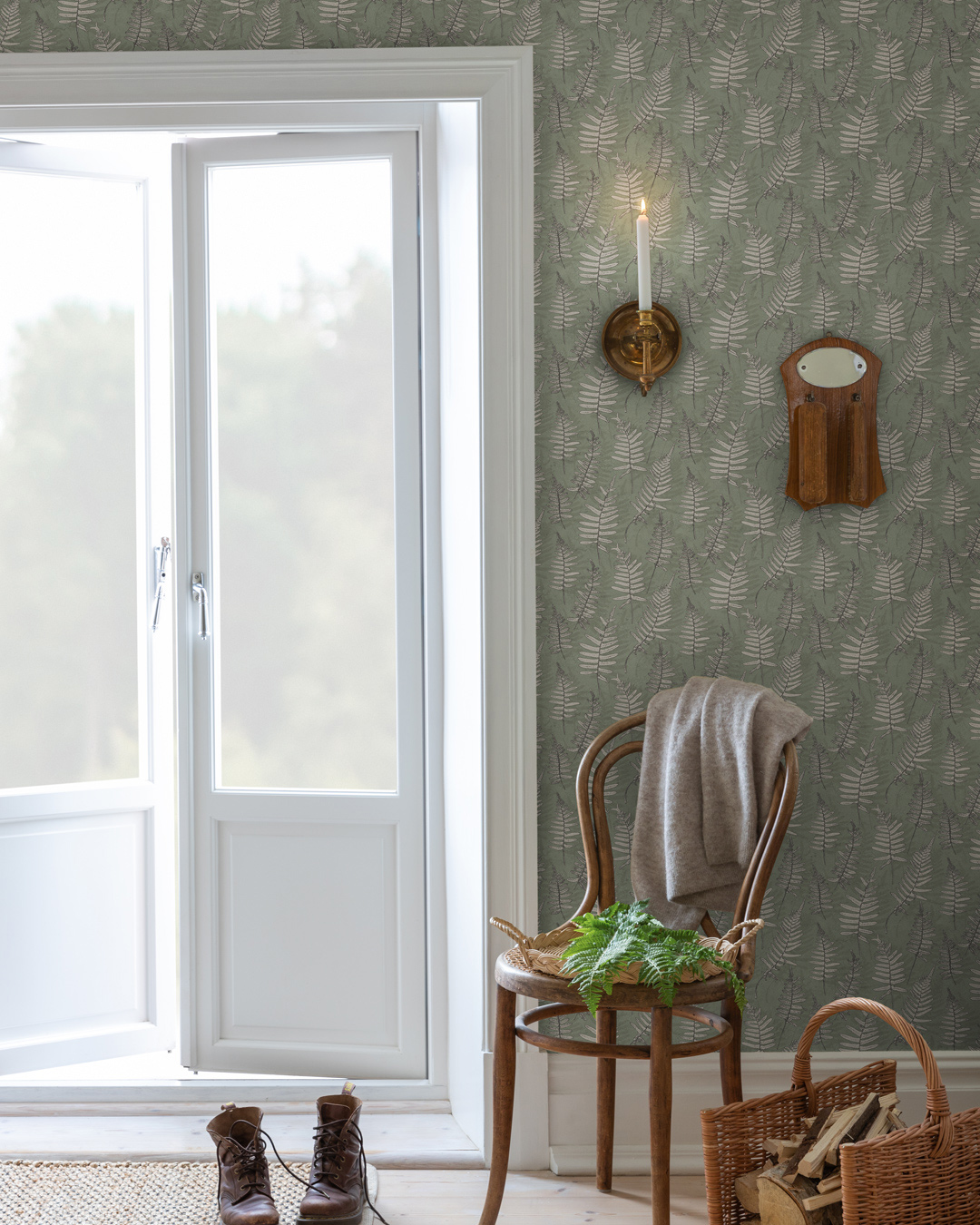 Ljusgrön tapet som drar sig mot den härliga nyansen "sage green" eller salvia som är den svenska motsvarigheten. Med en sage green färg på väggarna får du en neutral känsla i rummet. Den lilla nypan av grönt ger ett friskt och svalt intryck. Det man vid första anblick kanske tänker är en tapet med ormbunke är i själva verket växten stensöta som är besläktad med ormbunken.