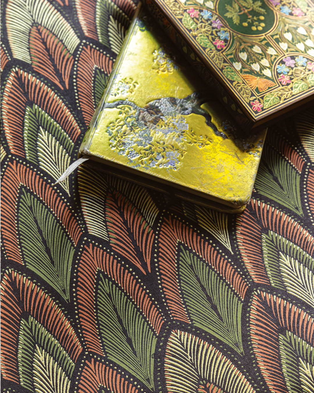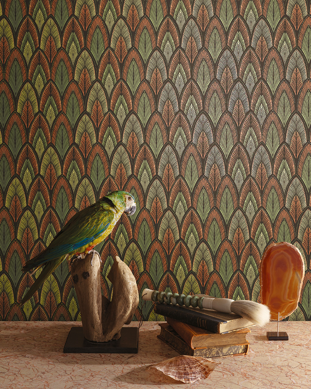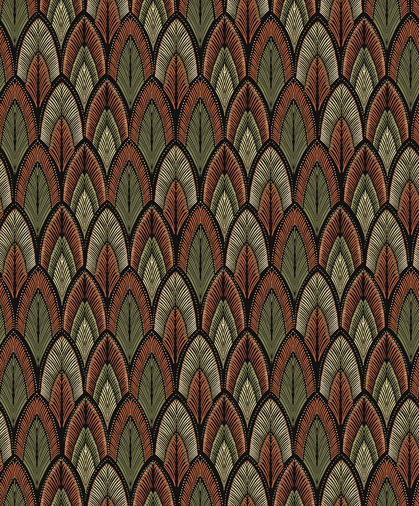 En färgstark oas av abstrakt bladmönster ger rummet en varm och välkomnande känsla. Dabu oasis i dämpade nyanser av gult, orange och grönt harmoniserar vackert mot sin mörka botten.