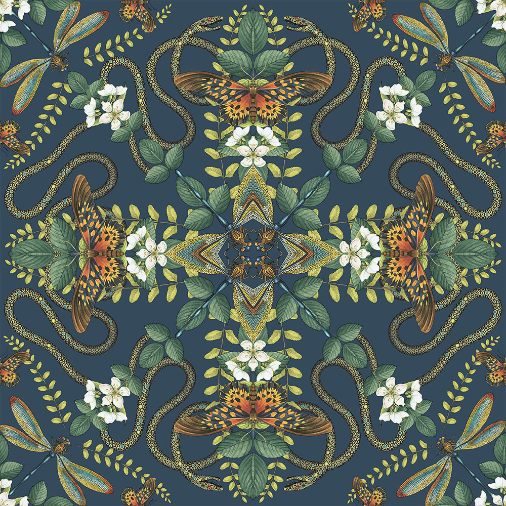 Tapeten Emerald Forest Midnight med sitt spännande mönster av stora färggranna fjärilar och trollsländor skapar ett lyxigt mönster tillsammans med slingrande guldiga ormar. Dess mörkblå botten ger en dramatisk effekt till motivet av djur tillsammans med vita jasmineblommor och gröna blad.