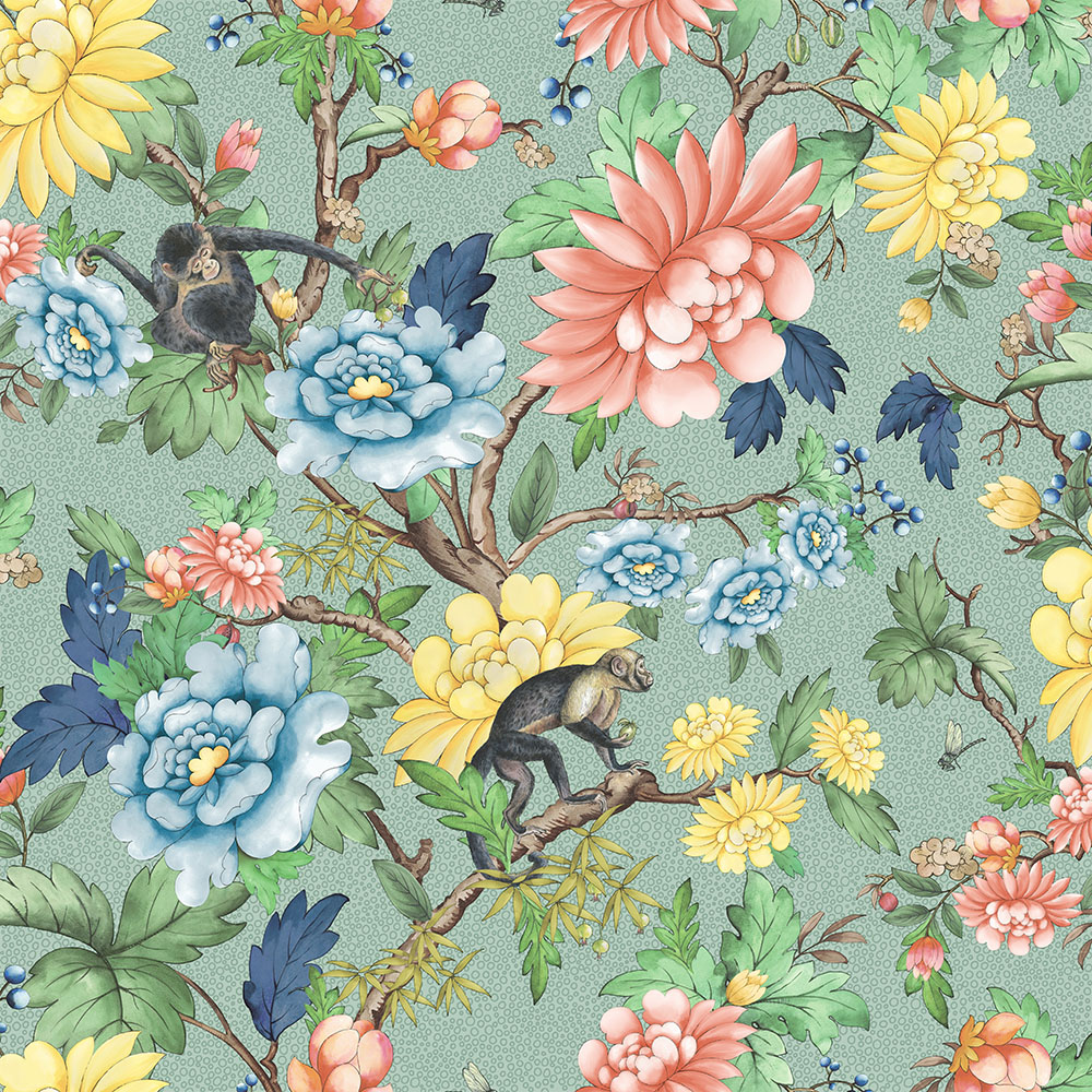 Turkos tapet med små reflekterande cirklar i botten pryder de livliga tapetmönstret Sapphire Garden. Med apor som klättrar och hoppar bland de blomsterklädda trädtopparna, sprider de en smakfull lekfullhet till ditt hem.