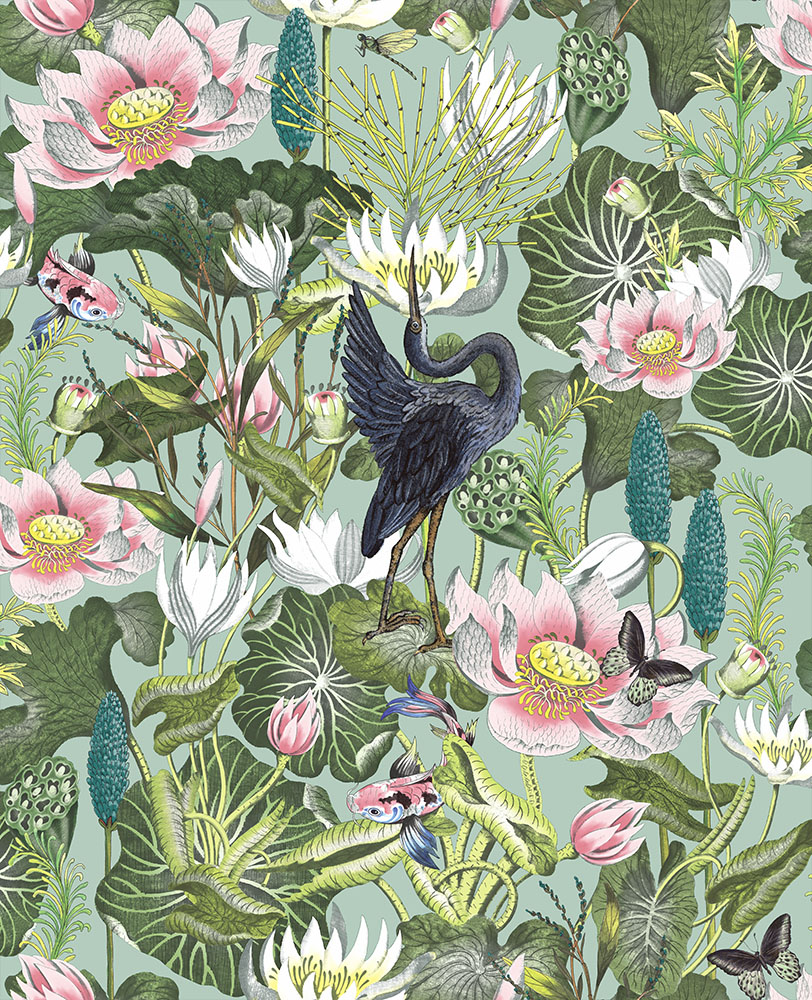 Turkos tapet fylld med exotisk växtlighet flätas samman med fåglar, fiskar och smådjur med vingar. Sprudlande färger som skapar karaktär och liv till ditt utrymme. Näckroserna vävs samman mellan bladverk och djur av olika slag.