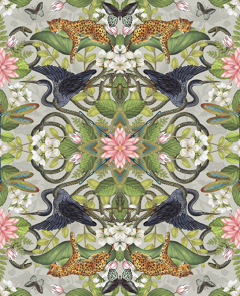 Exotiska djur och flora döljer sig djupt inne i Amazonas djungel. Fåglar, fjärilar, ormar och leoparder samlas i ett spännande möte. En gråblå botten skapar en lugn kontrast och låter mönstret få stå i centrum. Mönstret finns i 3 färgställningar.