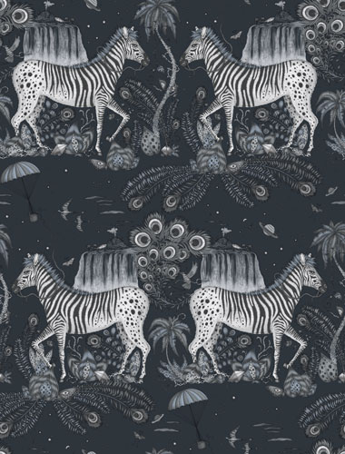 En natthimel full av stjärnor, planeter och uråldriga landskap. En zebrapåfågel stoltserar runt omgiven av botanik i gråa och blåa nyanser. En mörkblå tapet (nästan svart) med exotiska växter och djur skapar nästan ett intryck av en kritmålning. Mönstret Lost World finns i 5 färgställningar.
