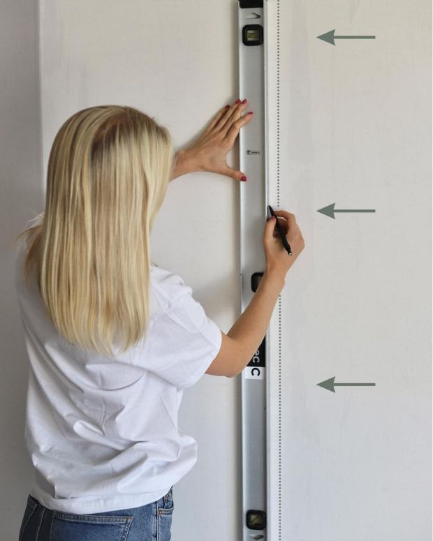 Väggar och hörn är sällan helt raka. Det gör inte så mycket, det löser du! Gör en tunn lodrätt linje (med blyerts) vid 51 cm markeringen. Vi rekommenderar att du använder vattenpass (eller laser). Det är denna linje du sedan ska följa när du sätter upp första våden, på så sätt vet du att första våden och efterföljande våder sitter rakt.